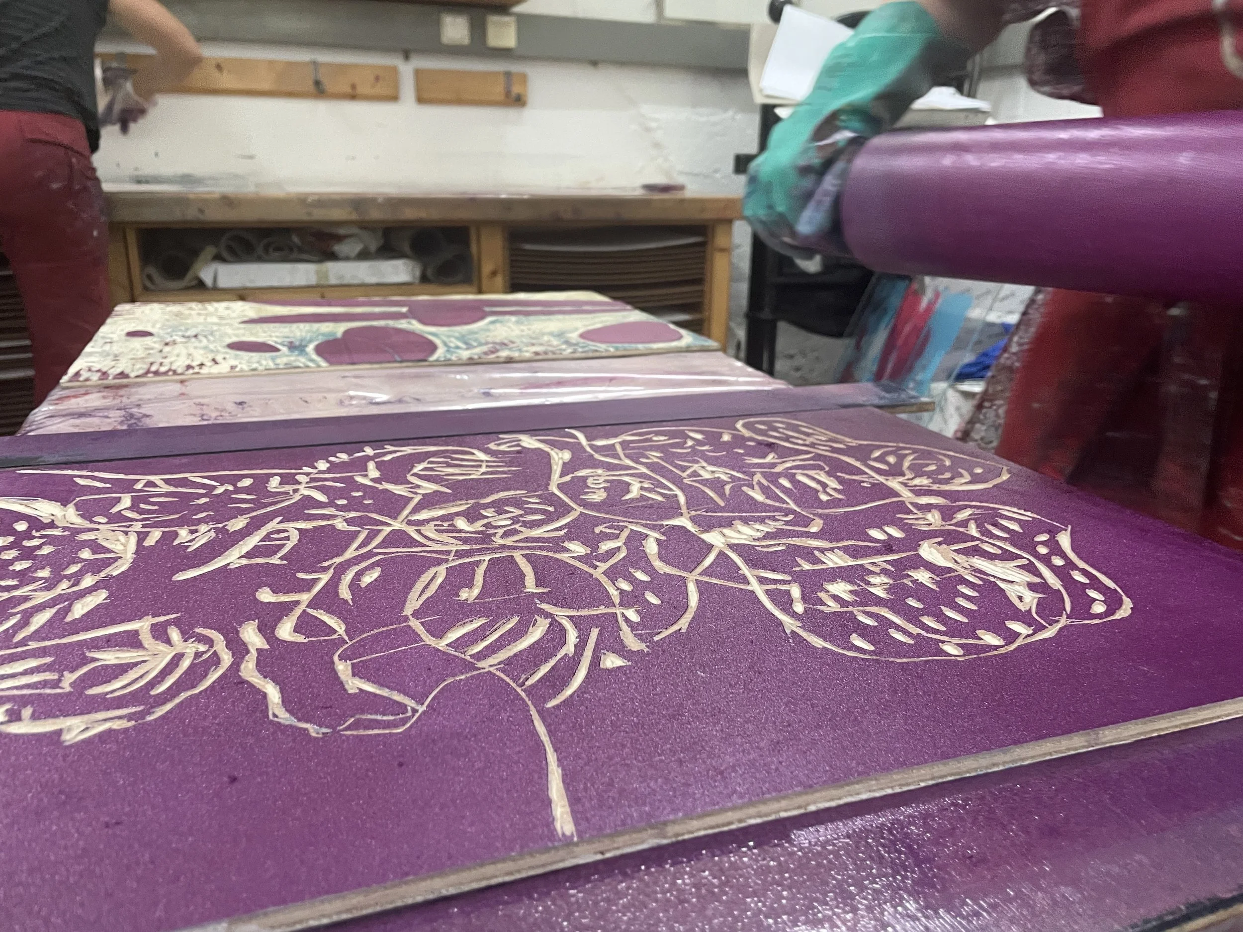 Die Teilnehmenden durchlaufen alle Phasen der Arbeit: von der ersten Zeichnung über die Übertragung auf den Holzstock, das Schneiden der Druckform, das Einfärben bis hin zum